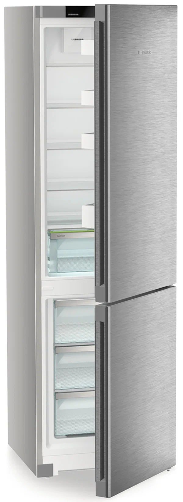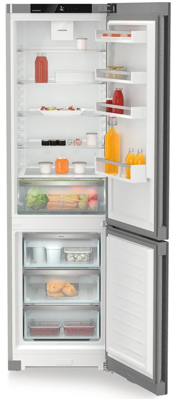 В холодильной камере предусмотрен контейнер EasyFresh: плотно закрывающийся ящик повышает влажность за счёт самих продуктов и помогает дольше сохранять их свежими. Для быстрого доступа и удобной организации пространства есть стеклянные полки с регулировкой по высоте, светодиодное потолочное освещение и продуманная дверная система хранения. DuoCooling с двумя раздельными контурами исключает обмен воздухом между камерами, предотвращая пересыхание и смешение запахов.