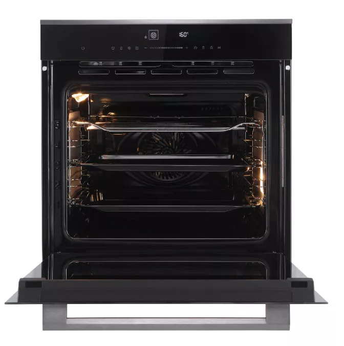 Технологии шкафа заботятся о комфорте и безопасности. Тройное остекление дверцы удерживает тепло внутри, экономя энергию и делая внешнюю поверхность безопасной для прикосновения. Доводчик дверцы обеспечивает плавное и тихое закрывание. Система автоматического охлаждения защищает кухонный гарнитур от перегрева, циркулируя холодный воздух вдоль боковых стенок.